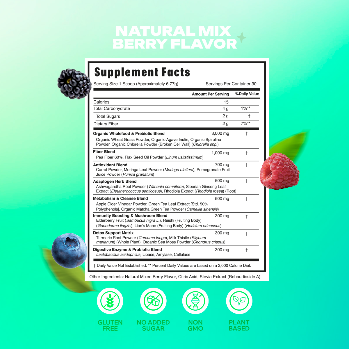 🧾 Ingredients per Serving (1 scoop) Organic Spirulina, Organic Chlorella, Organic Wheatgrass, Organic Barley Grass, Sea Moss Powder, Apple Cider Vinegar Powder, Matcha Green Tea, Inulin (Prebiotic Fiber), Ashwagandha Root, Moringa Leaf, Beet Root, Lemon Powder, Stevia Leaf Extract.